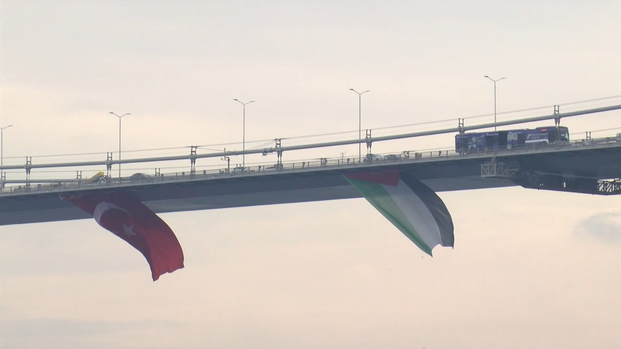 İstanbul Boğazı'ndaki köprülere Filistin'e destek için bayrak asıldı