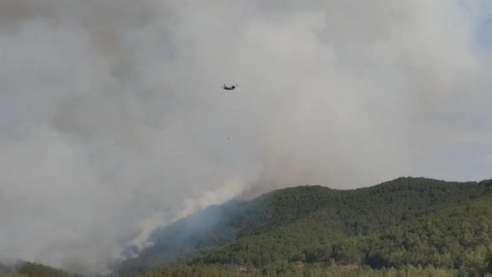 9 helikopter, 72 arazöz ve 554 personelle yangını söndürmek için ekiplerin karadan ve havadan müdahalesi devam ediyor.